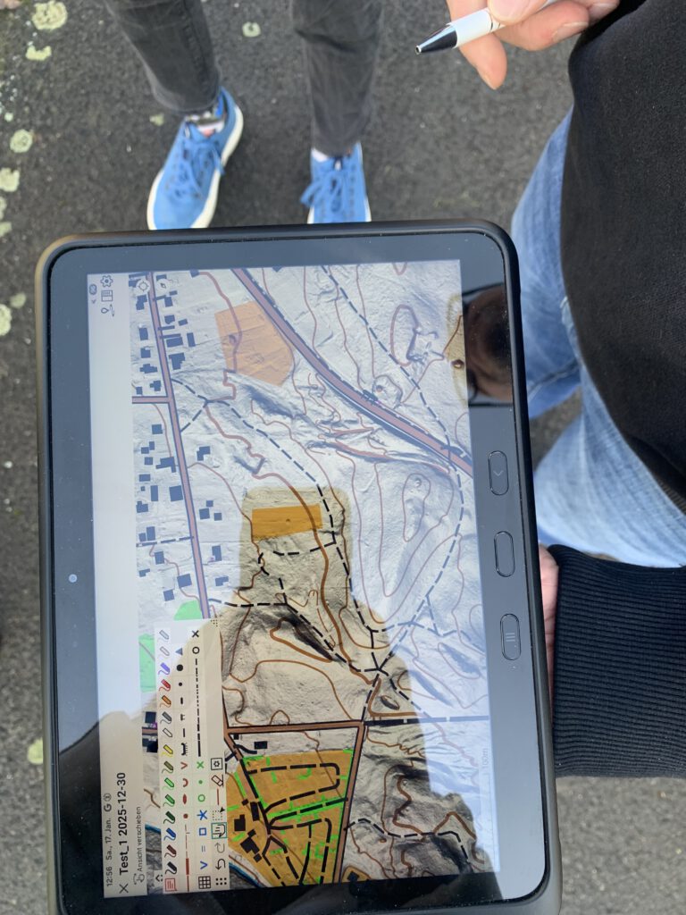 Mit dem Zeichenprogramm OCAD wurde zunächst schrittweise die Vorgehensweise für das Erstellen einer Grundkarte erklärt. Anschließend wurde diese dann zur OCAD App transferiert. Mit der App auf dem Handy oder auf dem Tablett ging es in den Wald, um die Grundkarte mit dem Gelände abzugleichen, Korrekturen vorzunehmen oder neue Objekte einzuzeichnen. Die Schwierigkeit dabei war zu entscheiden, welche Details man einzeichnen soll und was man zur besseren Lesbarkeit einer OL-Karte besser weglässt.